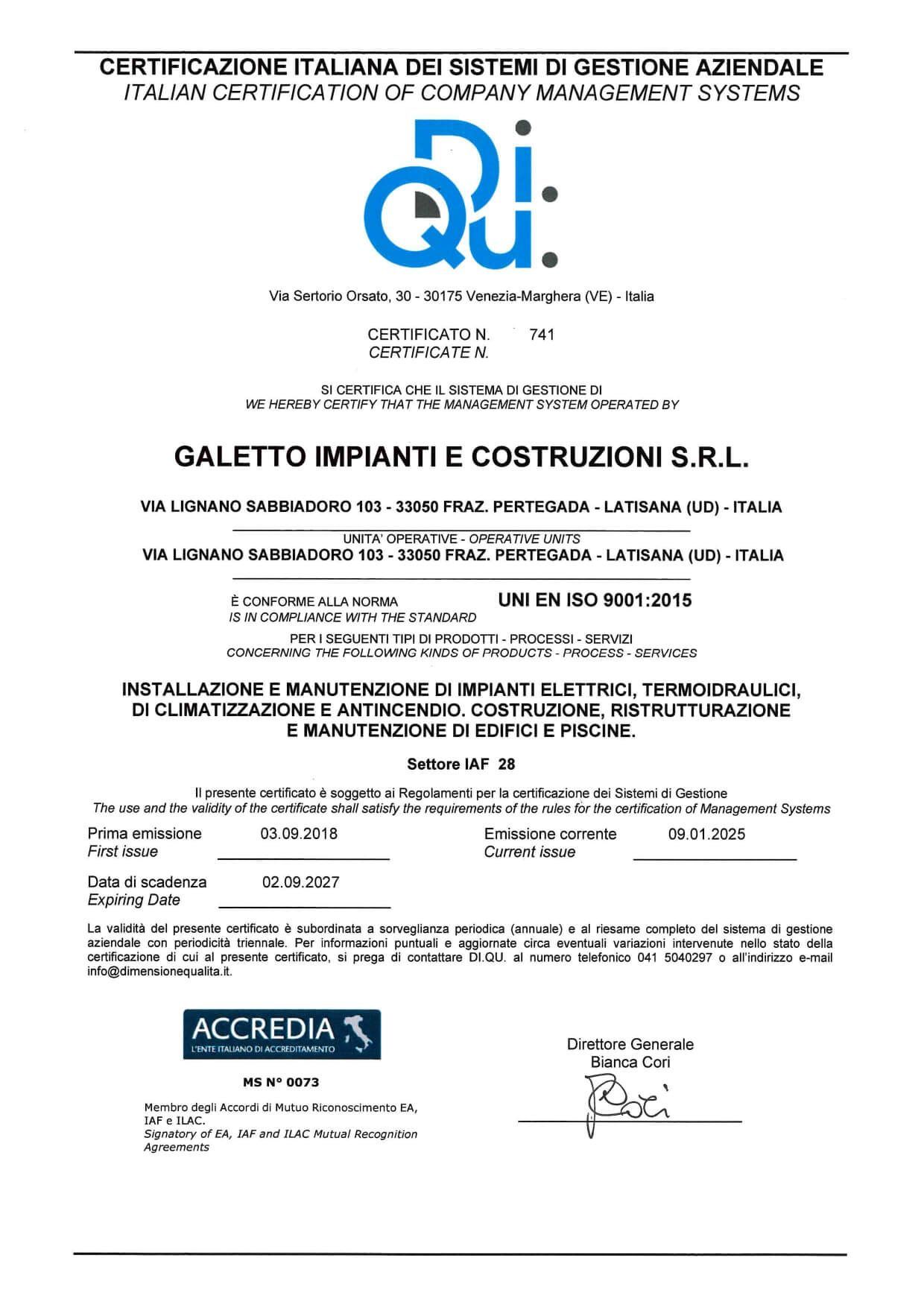 Inoltre, la nostra Società è certificata per la qualità aziendale secondo la norma UNI EN ISO 9001:2015, con attestazione rilasciata da Di.Qu. srl.